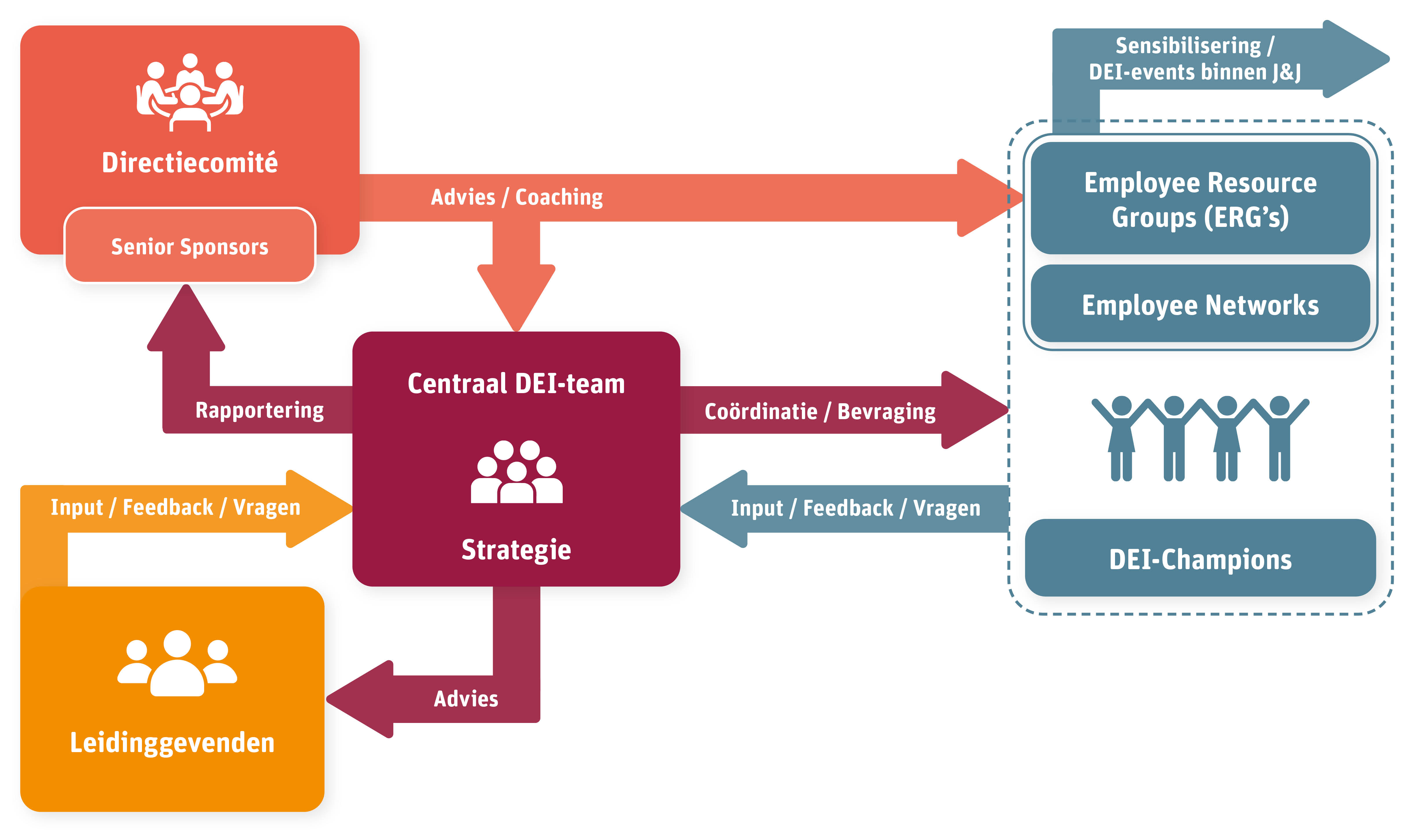 Niet enkel “bottom-up”. DEI is een belangrijke bedrijfsdoelstelling. Het wordt gedragen door het topmanagement. De senior sponsors uit de Raad van Bestuur zijn waardevolle raadgevers.